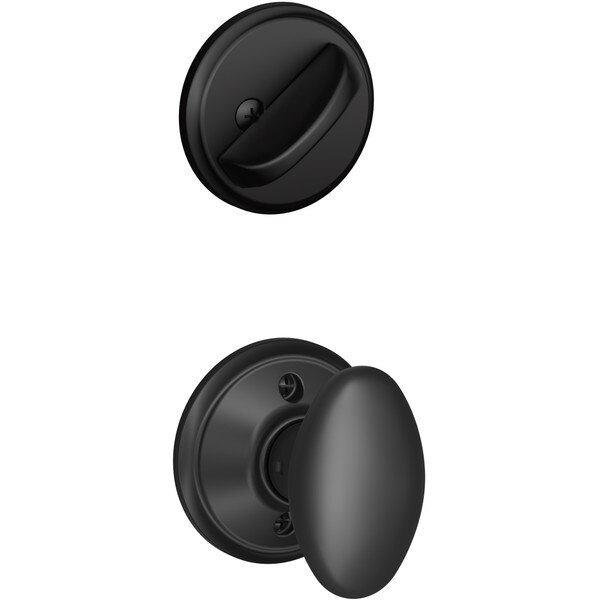 The Schlage Interior Handleset Siena Knob and Interior Single Cylinder Deadbolt Thumbturn in Matte Black is perfect for use on the interior of your front door. The Siena knob's eye –catching oval shape gives it a unique and memorable look, and looks especially elegant when finished in Matte Black. Plus, it's been designed and tested with strength and durability in mind.